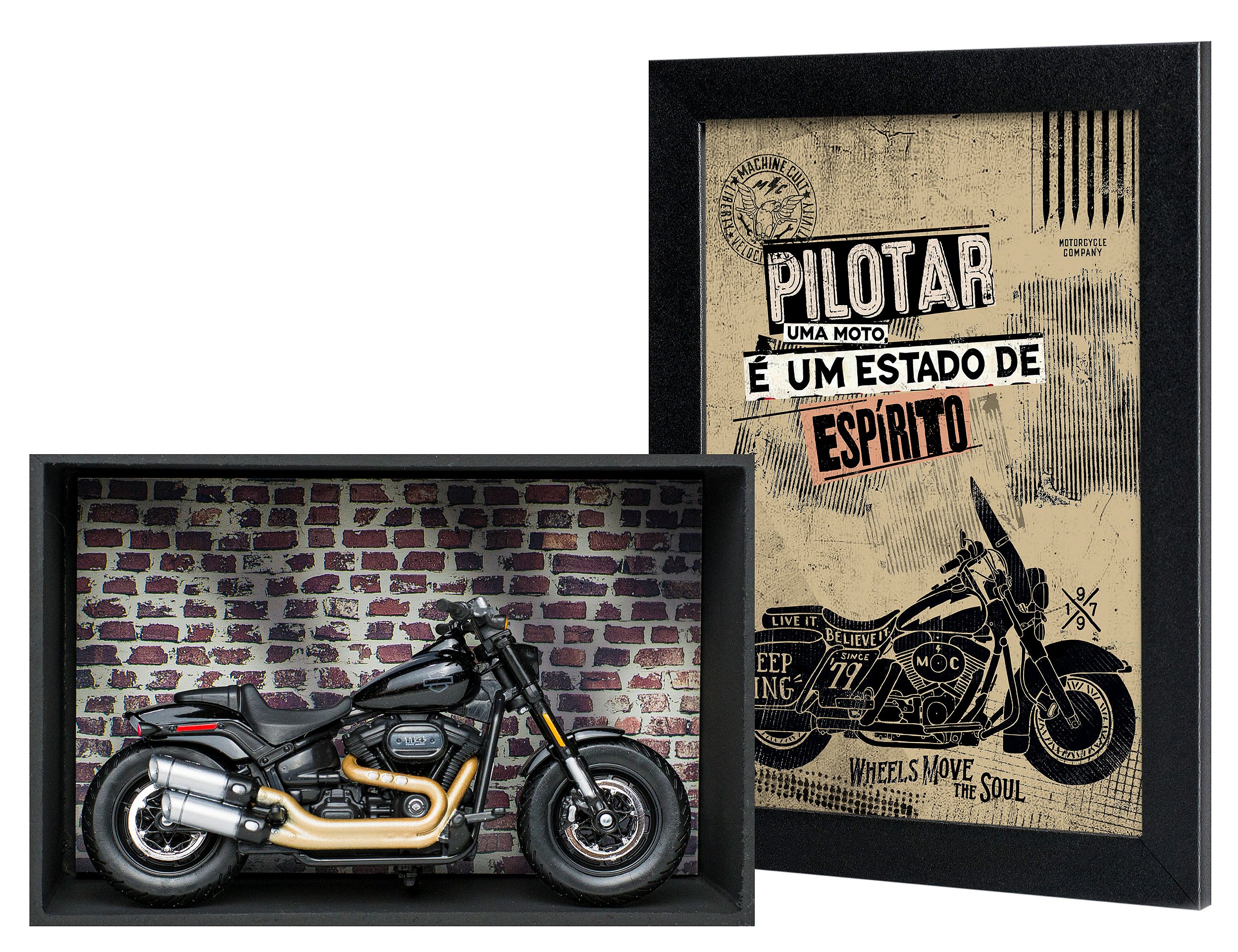 As fotos apresentadas abaixo são meramente ilustrativas. Elas mostram ideias e possibilidades de uso da Miniatura Harley-Davidson Fat Bob na decoração do seu ambiente. Nas imagens, podem aparecer objetos e acessórios que não acompanham o produto ou kit. Recomendamos ler atentamente a descrição e conferir as fotos principais do produto antes da compra.