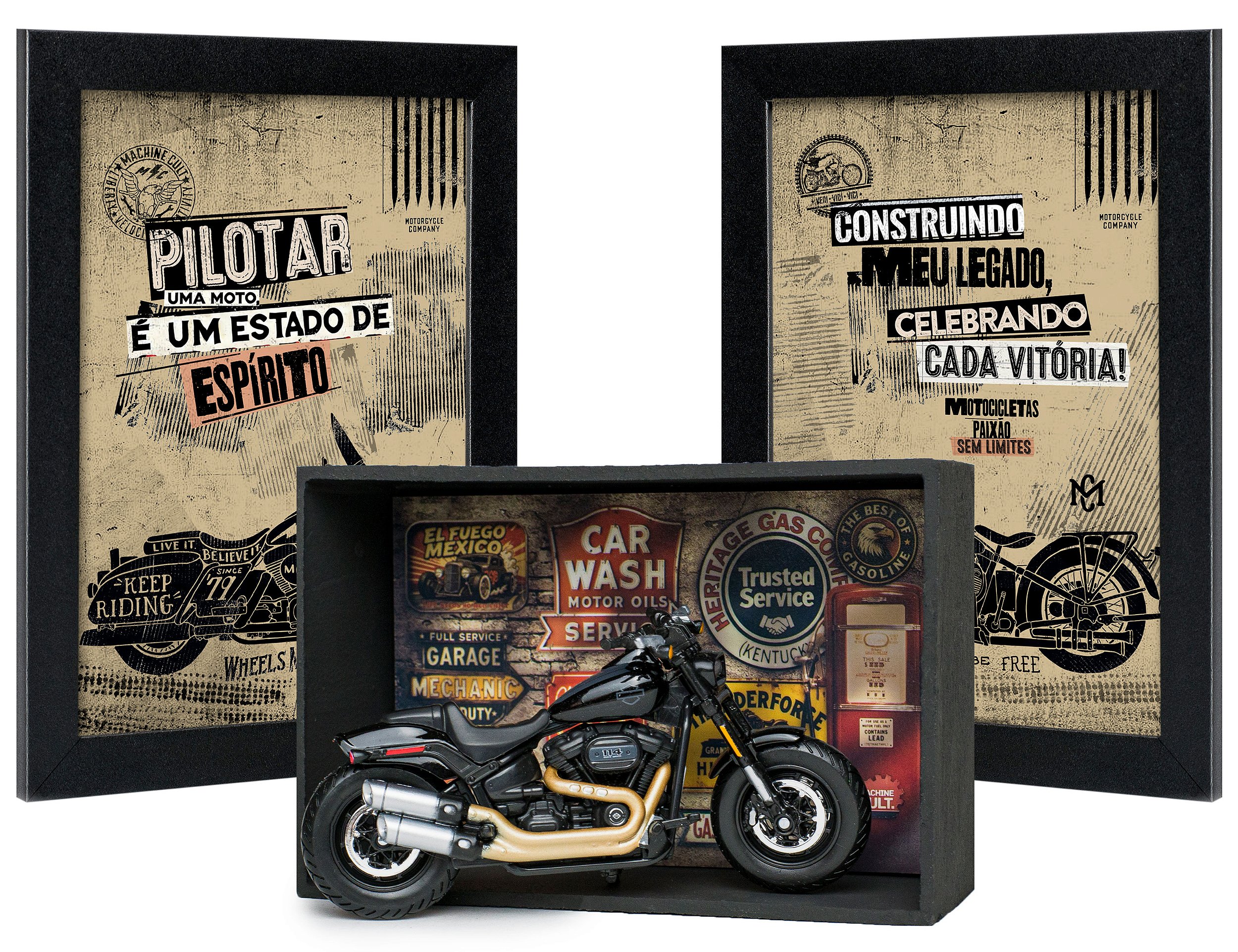 O Kit Miniatura Harley-Davidson 2022 Fat Bob 114 (cor preta) com expositor, cartão postal e quadros é uma excelente opção para presente de aniversário, dia dos namorados, dias dos pais, dia do amigo, amigo oculto e secreto, presente de natal e também para presentear-se. Ideal para apaixonados por Harley-Davidson! Ao comprar este kit você receberá os itens apresentados na foto (01 miniatura, 01 cartão postal, 01 expositor e 02 quadros). Detalhes da Miniatura Harley-Davidson 2022 Fat Bob 114 - Maisto: réplica em escala 1:18, marca Maisto, comprimento aproximado 13 cm, guidon ativo, suspensão traseira, pneus emborrachados, tanque em metal, partes em plástico, possui descanso para ficar em pé, miniatura oficial, produto novo e acompanha caixa. Detalhes do Expositor de Miniatura: altura 10cm, largura 15cm, profundidade da base 6 cm, feito em madeira e pintura preta fosca (acabamento rústico). Detalhes dos Quadros: 18x24cm, moldura em madeira, vidro, pendurador traseiro e imagem em impressão fotográfica. Marca: Machine Cult.
