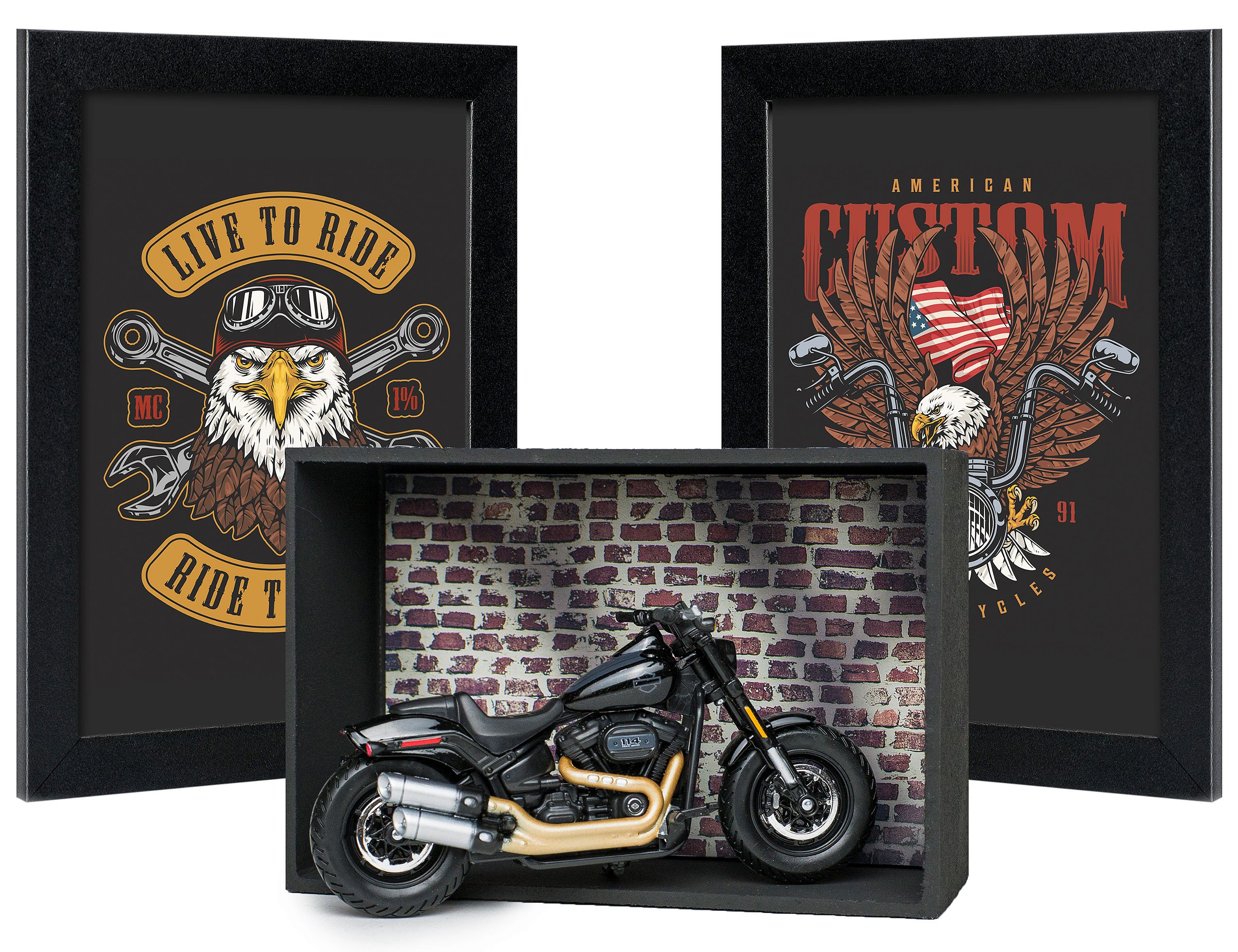 O Kit Miniatura Harley-Davidson Kit Presente de Natal com Expositor e Quadros é uma excelente opção para presente de aniversário, dia dos namorados, dias dos pais, dia do amigo, amigo oculto e secreto, presente de natal e também para presentear-se. Ideal para apaixonados por Harley-Davidson! Ao comprar este kit você receberá os itens apresentados na foto (01 miniatura, 01 expositor e 02 quadros). Detalhes da Miniatura Harley-Davidson Fat Bob - Maisto: réplica em escala 1:18, marca Maisto, comprimento aproximado 13 cm, guidon ativo, suspensão traseira, pneus emborrachados, tanque em metal, partes em plástico, possui descanso para ficar em pé, miniatura oficial, produto novo e acompanha caixa. Detalhes do Expositor de Miniatura: altura 10cm, largura 15cm, profundidade da base 6 cm, feito em madeira e pintura preta fosca (acabamento rústico). Detalhes do Quadro: 18x24cm, moldura em madeira, vidro, pendurador traseiro e imagem em impressão fotográfica. Marca: Machine Cult.