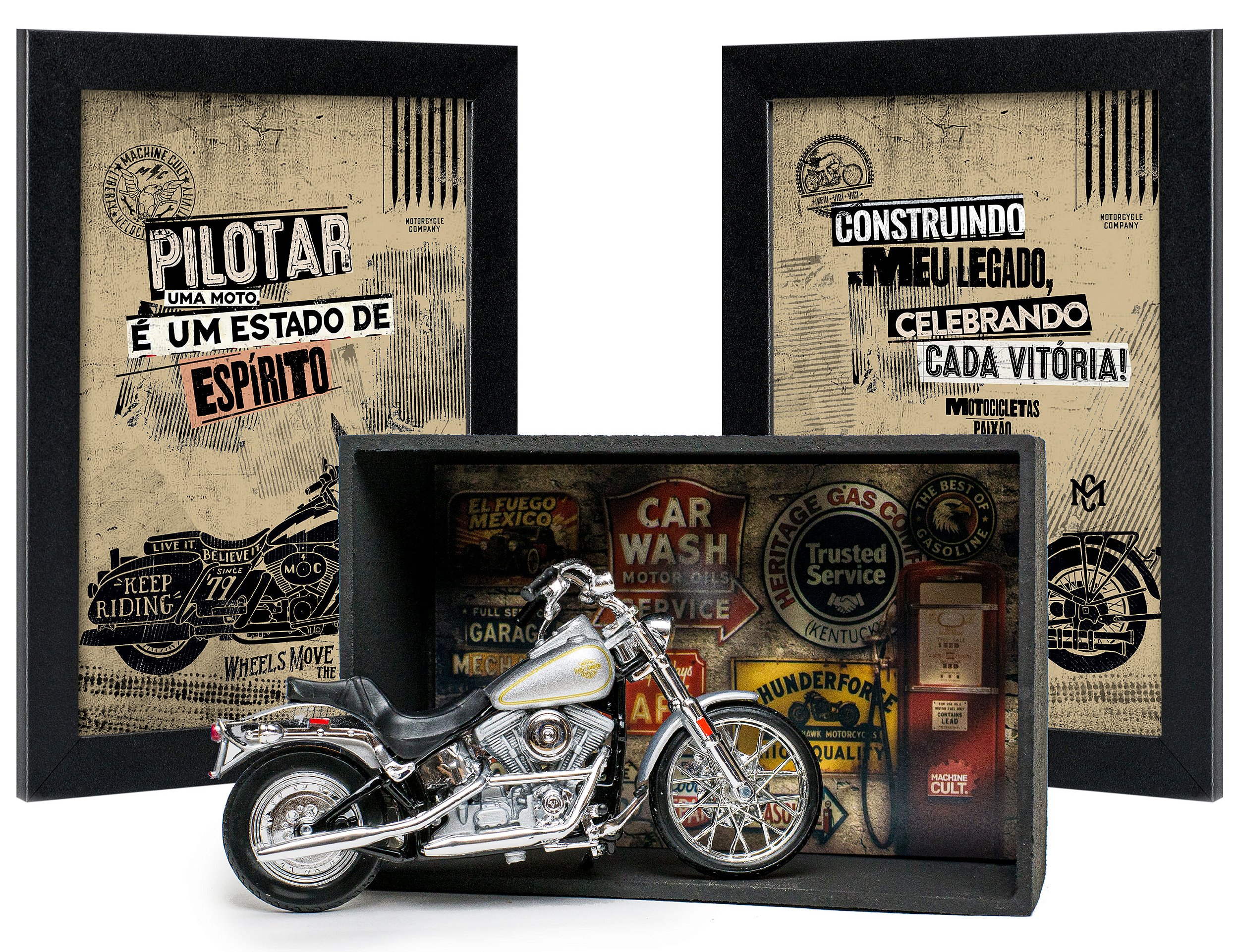 O Kit Miniatura Harley-Davidson Kit Presente Dia das Crianças com Expositor e Quadros é uma excelente opção para presente de aniversário, dia dos namorados, dias dos pais, dia do amigo, amigo oculto e secreto, presente de natal e também para presentear-se. Ideal para apaixonados por Harley-Davidson! Ao comprar este kit você receberá os itens apresentados na foto (01 miniatura, 01 expositor e 02 quadros). Detalhes da Miniatura Harley-Davidson Softail 1984 FXST - Maisto: réplica em escala 1:18, marca Maisto, comprimento aproximado 13 cm, guidon ativo, suspensão traseira, pneus emborrachados, tanque em metal, partes em plástico, possui descanso para ficar em pé, miniatura oficial, produto novo e acompanha caixa. Detalhes do Expositor de Miniatura Vintage Wall: altura 10cm, largura 15cm, profundidade da base 6 cm, feito em madeira e pintura preta fosca (acabamento rústico). Detalhes do Quadro: 18x24cm, moldura em madeira, vidro, pendurador traseiro e imagem em impressão fotográfica. Marca: Machine Cult.