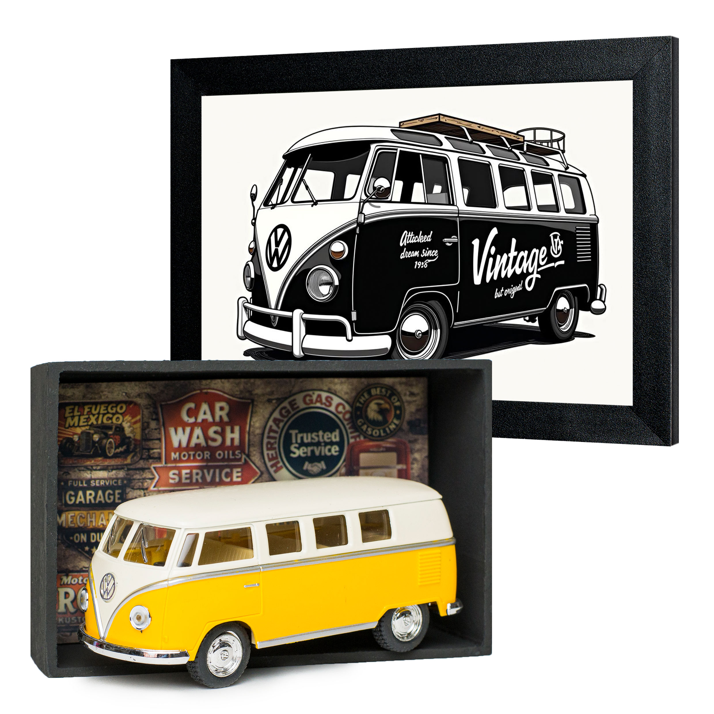 O Kit Presente Perua Kombi é composto pelos seguintes produtos: Miniatura Perua Kombi 1962, Expositor e Quadro. Tamanho do expositor de miniaturas: Altura: 10cm, Largura: 15cm e Profundidade da base: 7cm. Tamanho da Miniatura: escala 1:32, aproximadamente 13cm. Tamanho do Quadro: 18x24cm. O Kit Presente Perua Kombi oferece uma incrível seleção de itens que certamente encantarão os amantes de carros clássicos e entusiastas da marca Volkswagen. Este conjunto exclusivo é cuidadosamente composto por três elementos distintos que celebram a icônica herança do Kombi, permitindo que você mergulhe na nostalgia e aprecie a beleza atemporal deste veículo. Com o Kit Presente Perua Kombi, você não apenas adquire uma miniatura de alta qualidade do Kombi de 1962, mas também recebe um expositor elegante e um quadro decorativo, oferecendo uma experiência completa e autêntica dedicada à lendária jornada da Kombi. Este conjunto é o presente perfeito para os apaixonados por automóveis e entusiastas da Volkswagen, permitindo que eles compartilhem sua paixão por esse ícone automobilístico com estilo e sofisticação. Adquira agora este conjunto exclusivo e celebre a história da Kombi de uma maneira única e memorável. O Kit Presente Minaitura Perua Kombi é uma excelente opção para presente de aniversário, dia dos Namorados, dia dos Pais, dia das Crianças, amigo oculto e secreto, presente de Natal e também para presentear-se.